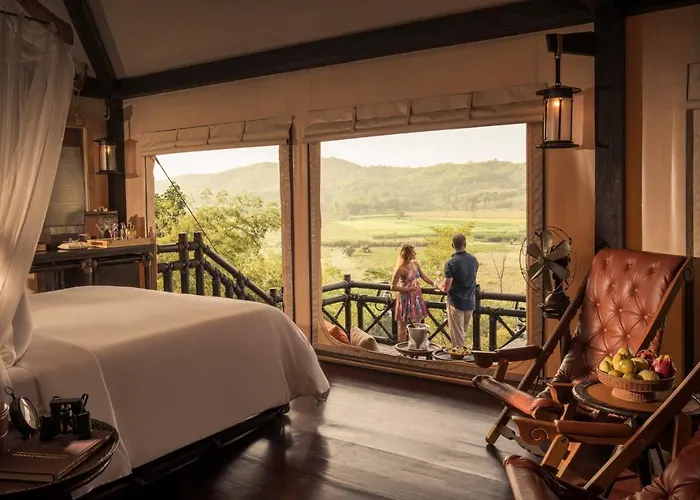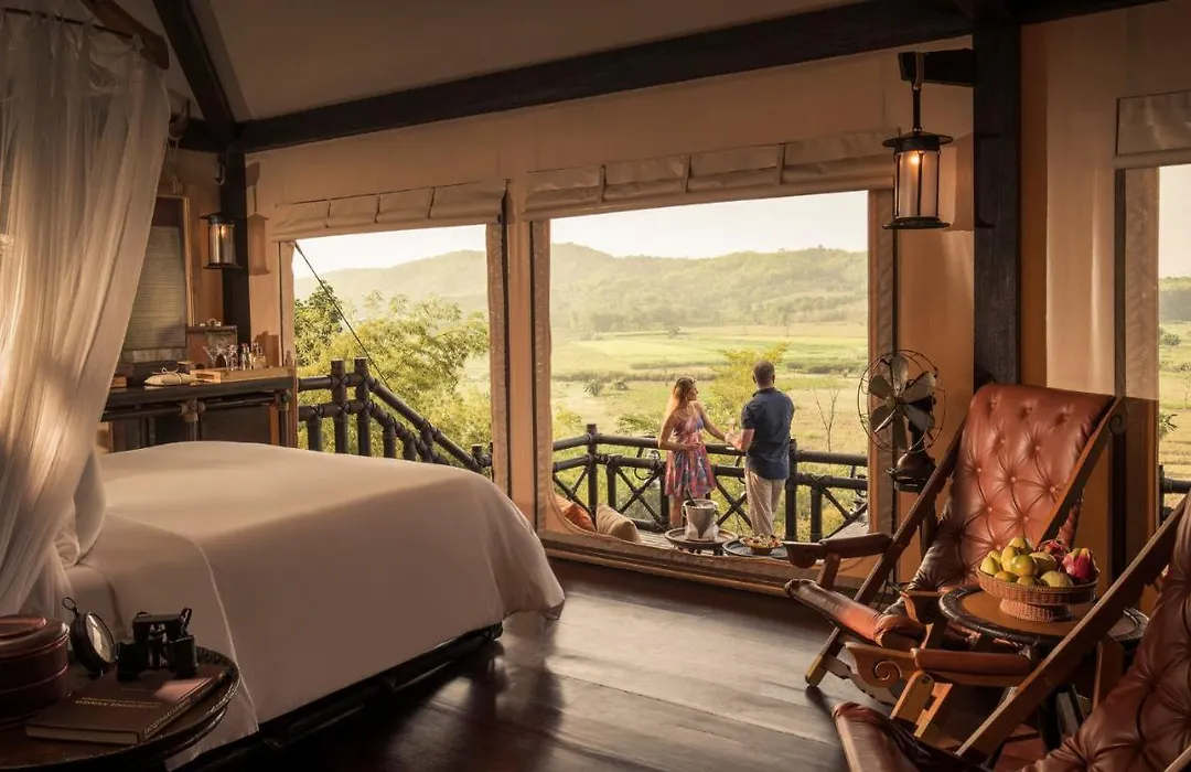 Experience the ultimate in luxury camping at Four Seasons Tented Camp Golden Triangle, a 5-star retreat rated 9.4/10 on Booking.com. Guests will enjoy unique glamping accommodations nestled among the lush jungle, all-inclusive dining, and various nature experiences, including interactions with rescued elephants.