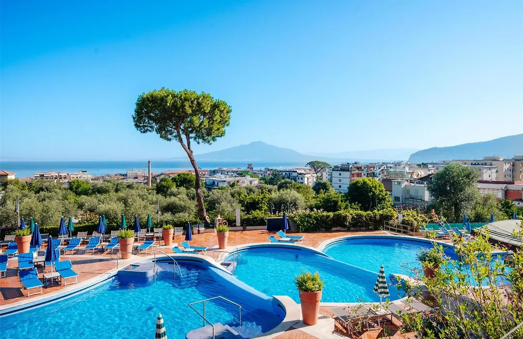 Hilton Sorrento Palace, a 4-star resort rated 8.7/10 on Booking.com, features six outdoor pools and scenic views of the Bay of Naples and Mount Vesuvius. The hotel offers a family-friendly atmosphere with various dining options and recreational activities, including a fitness center and tennis courts.