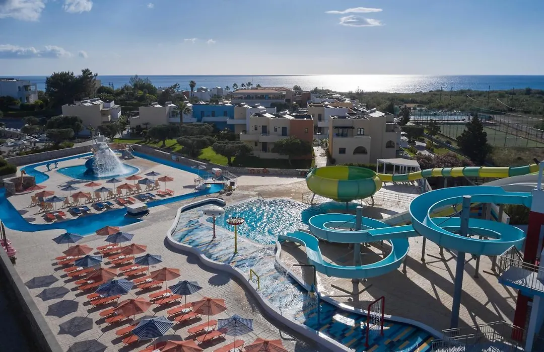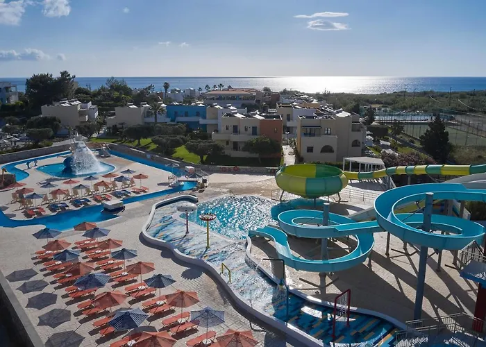 Atlantica Mikri Poli Rhodes is a 4-star, family-friendly resort situated in Kolymbia, featuring a large waterpark with a free-fall slide and multiple swimming pools. This all-inclusive property offers diverse dining options and a range of activities suitable for children and adults alike.