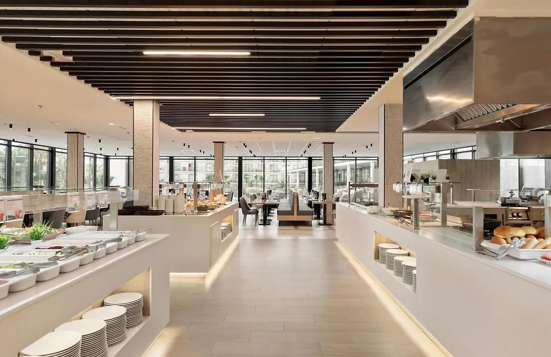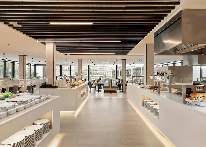 Dining options at Hotel Best Triton include a buffet restaurant, 'El Mercado', with show cooking and formal attire required for dinner. 'La Braseria' serves an exclusive menu for premium room guests during high season. Additionally, there are several bars available, including a poolside bar and the Sky Bar.