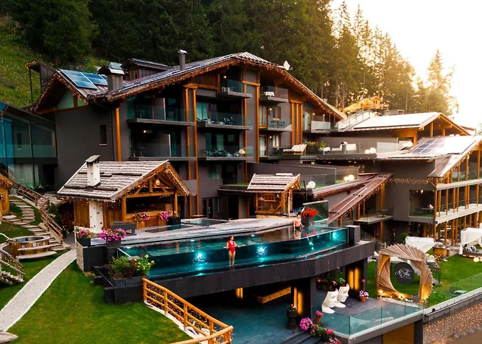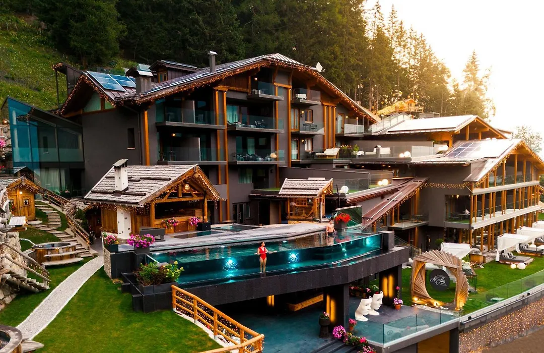Hotel Chalet Al Foss - Adults Only (5-star) features an infinity pool, panoramic Finnish sauna, and wellness center. Located in a serene environment surrounded by nature, this Vermiglio hotel offers a relaxing retreat with an emphasis on comfort and modern mountain design.