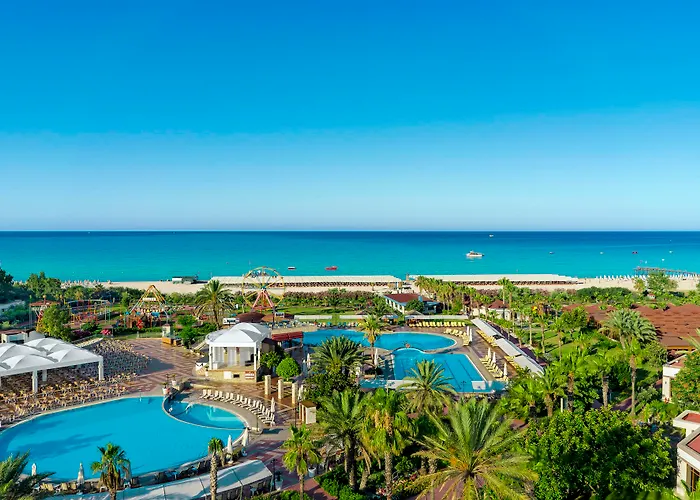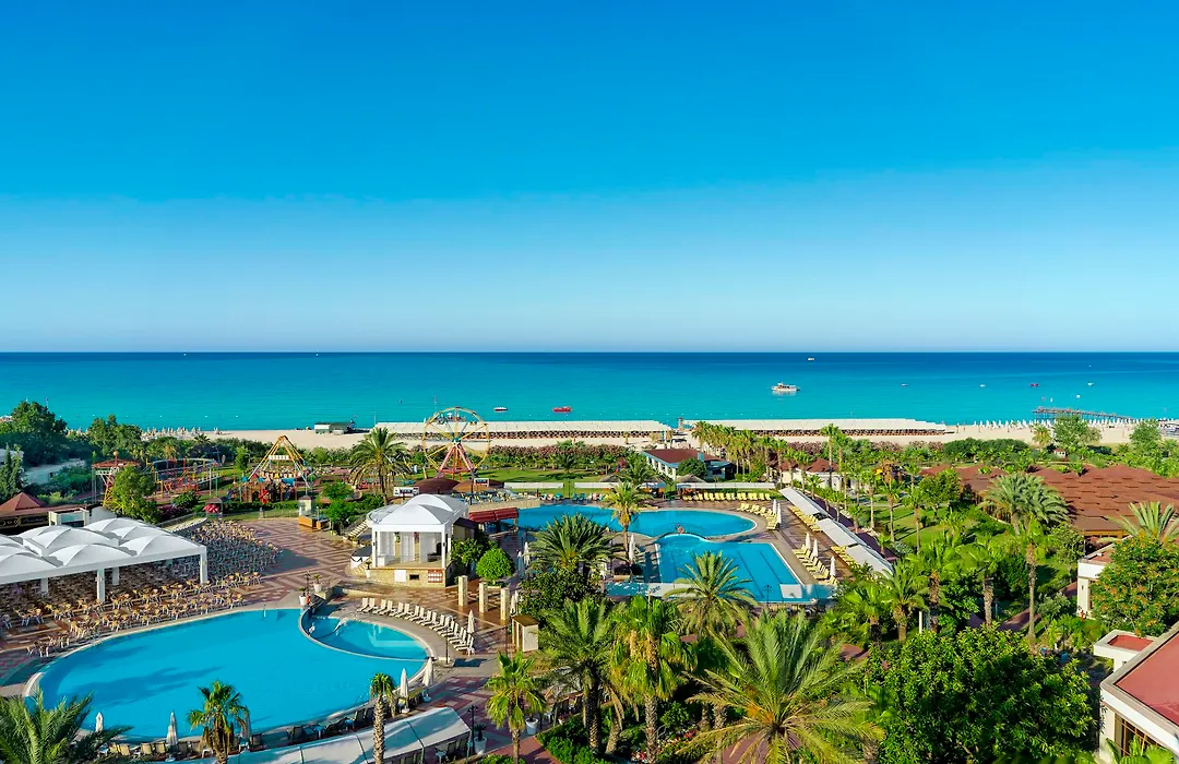 Club Hotel Turan Prince World - Kids Concept is a 5-star all-inclusive family-friendly resort with direct beach access and an extensive sport and leisure program. Featuring Ottoman-style architecture surrounded by lush gardens, it includes an on-site Aqua Park with 14 water slides and various dining options.