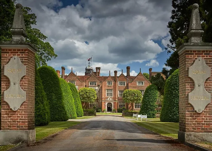 Great Fosters - Near Windsor, a 5-star hotel rated 8.1/10 on Booking.com, is situated within 20 hectares of historic gardens. The hotel features an art-deco heated outdoor pool, an upscale spa, and two acclaimed dining options including a Michelin-starred restaurant.