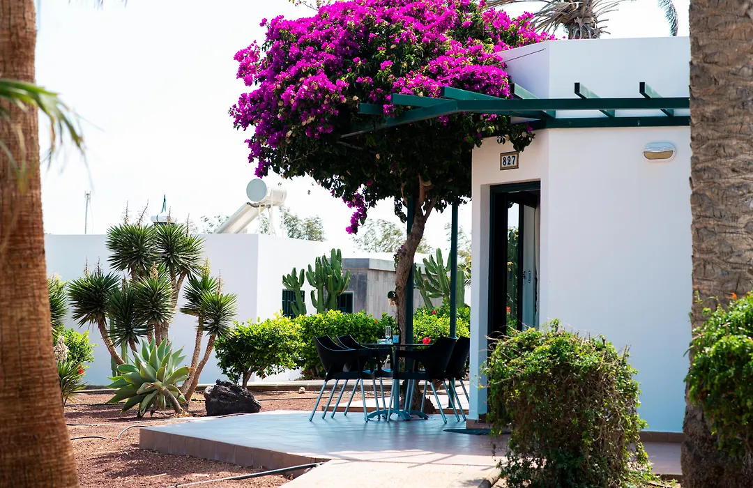 Rooms at Hl Club Playa Blanca are designed for comfort and functionality, featuring 1 and 2-bedroom bungalows with private terraces. Each bungalow includes a living room/bedroom setup, separate bedroom, a kitchenette with fridge, and a private bathroom.