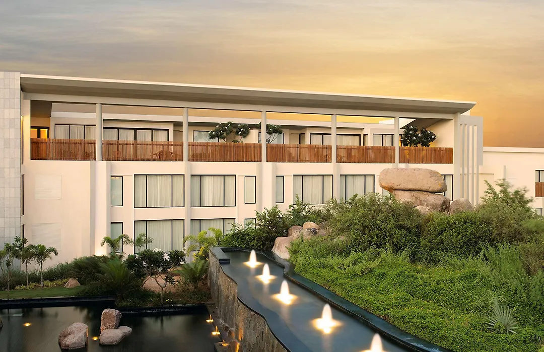Hyatt Hyderabad Gachibowli, a 5-star Hyderabad hotel with an 8.3/10 rating on Booking.com, features lush greenery and elegant accommodations. On-site amenities include a full-service spa, a 25-metre outdoor swimming pool, and two dining options, making it pet-friendly.