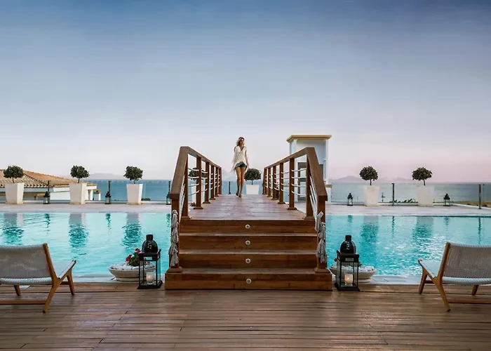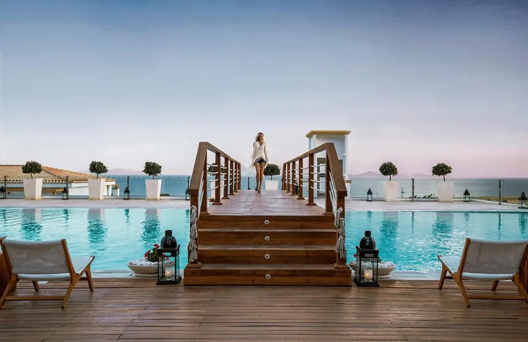 Mitsis Selection Blue Domes is a 5-star Pylion hotel featuring a crystal-clear pebble beach and an extensive array of amenities, including 6 bars and 3 takeaway restaurants. The hotel offers a beachfront experience along with modern accommodations that cater to families and groups.