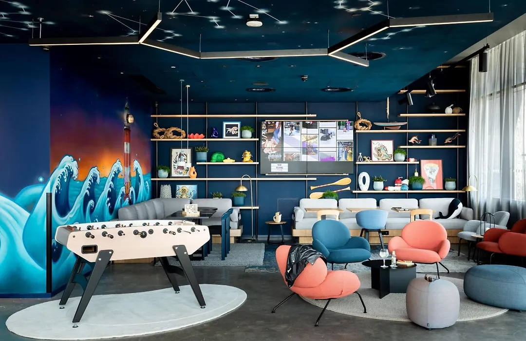 Dining options include a Moxy Bar that serves cocktails, snacks, and breakfast. A 24/7 Grab and Go station provides additional snacks and beverages for guests on the move.