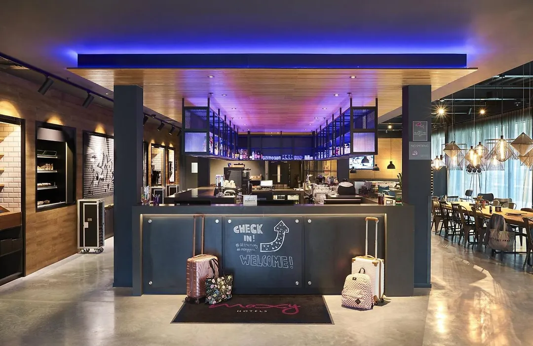 Leisure facilities feature a fitness center and shared spaces for social interaction, including the vibrant Moxy Bar, where guests can engage over hand-crafted drinks and games. The lobby is designed with contemporary furniture and includes a video wall.