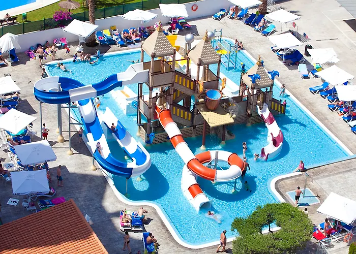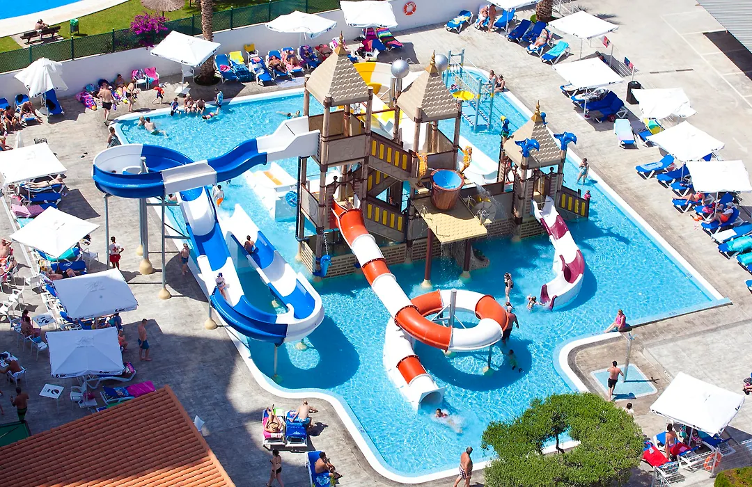 Hotel Rosamar, a 4-star family-friendly resort with a 7.9/10 rating on Booking.com, features a water park and a full buffet restaurant with show cooking. Additional amenities include a bar, cafeteria, and a full spa with wellness treatments, catering primarily to families with children.