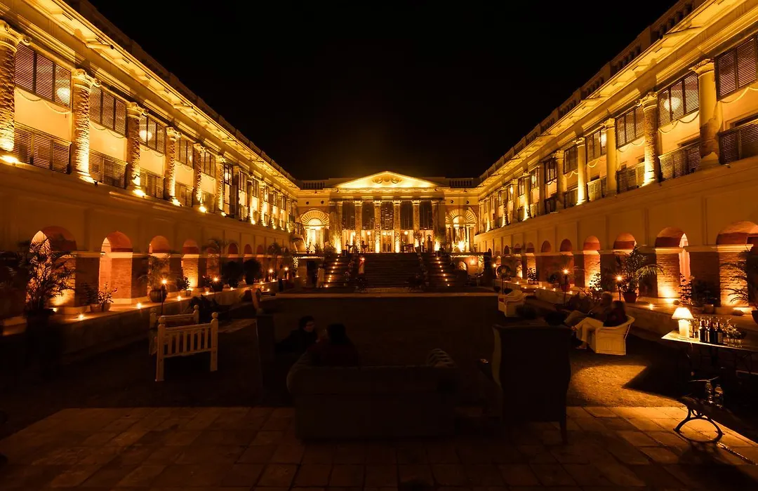 Dining options at The Rajbari Bawali include a restaurant where chefs craft diverse cuisines, drawing influence from Mughal, British, and other culinary traditions. Guests can experience unique dishes and flavors in an elegant setting.