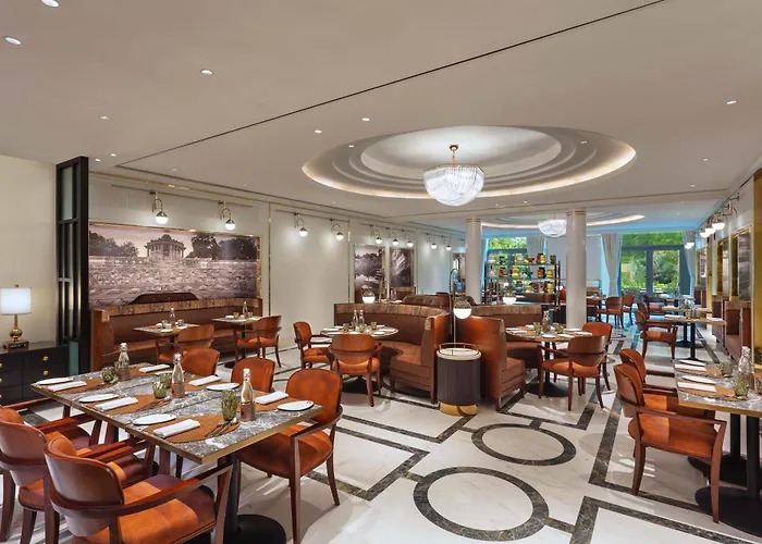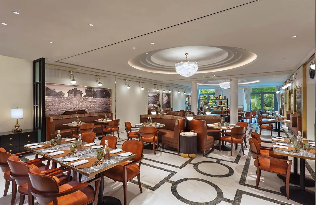 Dining options at the hotel include Adalaj Pavilion, an all-day dining restaurant serving regional and international cuisines, and Royal Vega, which specializes in vegetarian dishes. Peshawri offers North-West Frontier delicacies, while Fabelle - The Chocolate Boutique provides a unique chocolate experience.