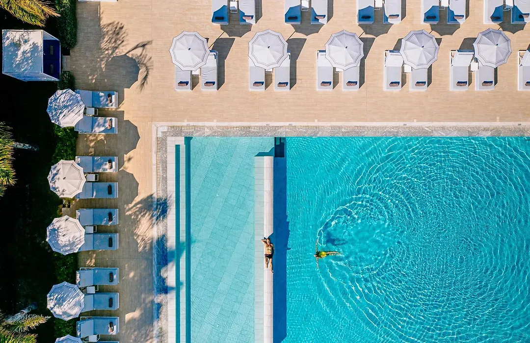 The Ivi Mare features leisure facilities such as a fitness room, sauna, steam room, and massage services. The Utopia Bar serves refreshments around the outdoor pool, enhancing the chic environment.