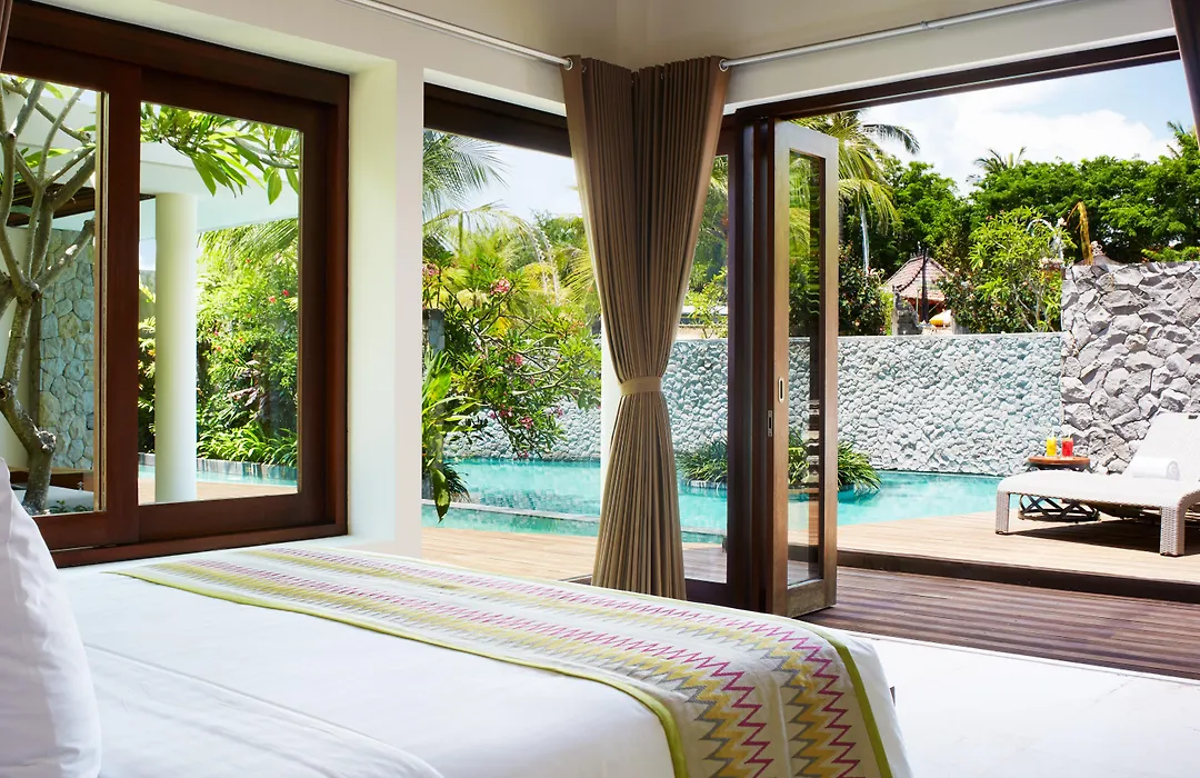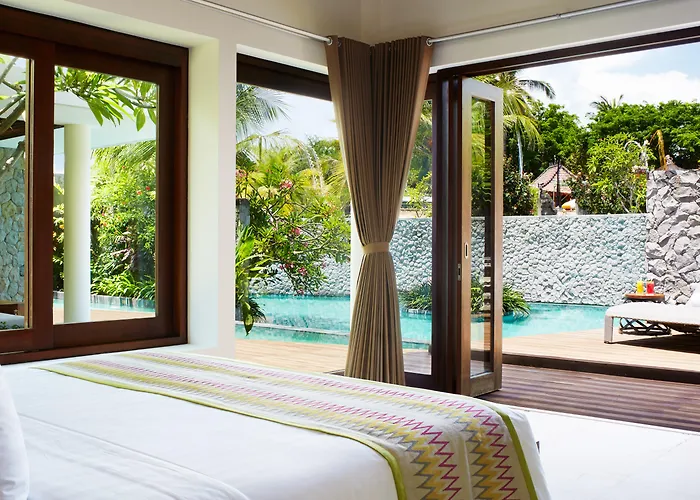 Rooms at Merusaka Nusa Dua include spacious layouts, private balconies, and luxurious amenities. Accommodations range from garden retreats to ocean-view options, with features such as flat-screen TVs, coffee machines, and minibars. Notably, the one-bedroom villas provide direct access to the pool and tropical gardens.