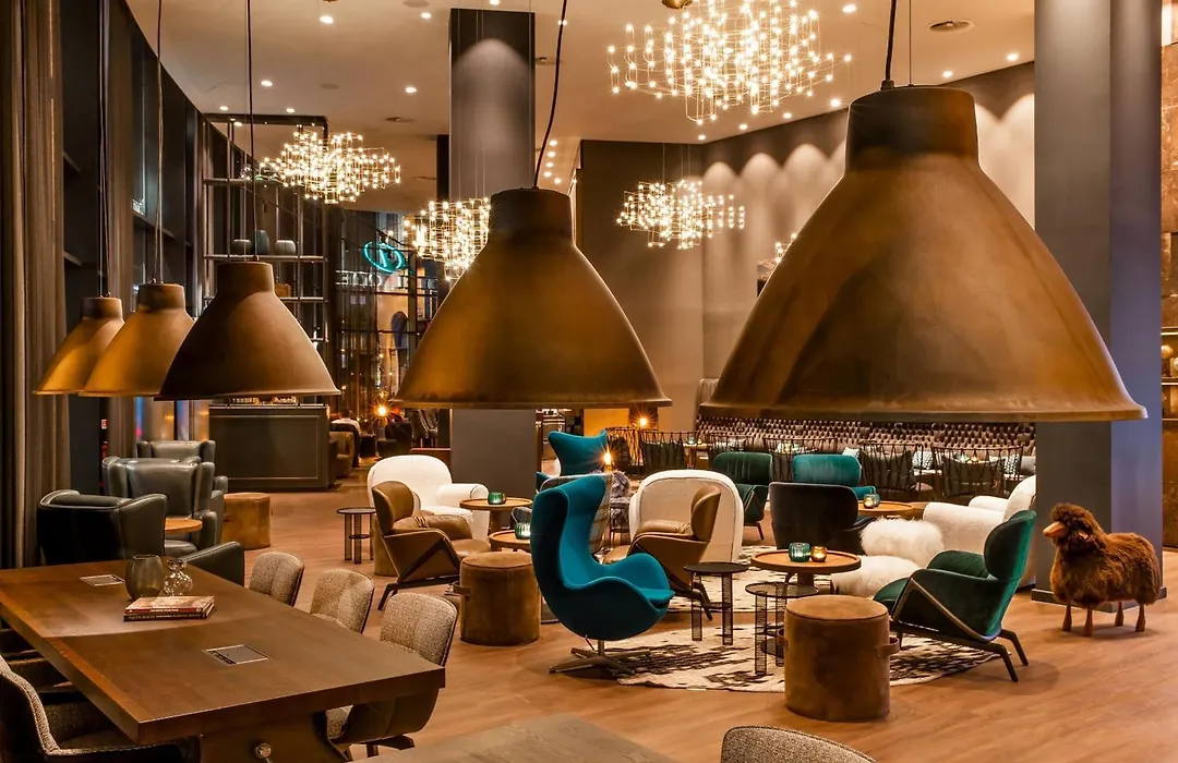 The hotel features a big open-plan lobby decorated with vintage suitcases, animal-print rugs, and signature Egg chairs designed by Arne Jacobsen. Local artworks by Matthew Dalziel and Louise Scullion enhance the hotel's unique aesthetic, emphasizing its connection to the region's industrial heritage.