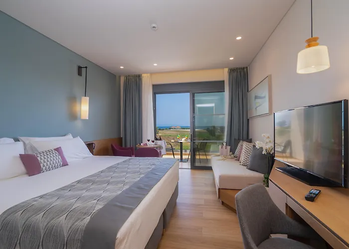 Apollonion Asterias Resort And Spa is a 5-star hotel renowned for its extensive amenities, including a 500 m² spa area and two outdoor swimming pools set in lush gardens. The hotel offers modern accommodations and fine dining options specializing in Greek and Mediterranean cuisine.