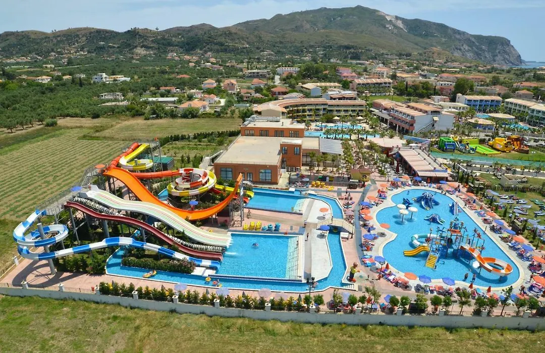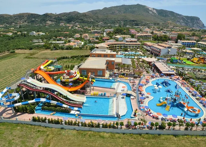 Caretta Beach Resort & Waterpark is a modern family hotel featuring a vast on-site waterpark and five swimming pools. This 4-star Kalamaki (Zakynthos) hotel offers various dining options and a range of amenities for a memorable stay.