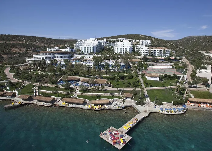 Bodrum Holiday Resort & Spa is a 5-star all-inclusive hotel featuring a vast array of facilities including an aqua park, multiple swimming pools, and a private beach. The resort combines exceptional amenities with unique views of the Aegean region's natural beauty and is only 4.5 km from the vibrant nightlife of the popular holiday resort of Bodrum.