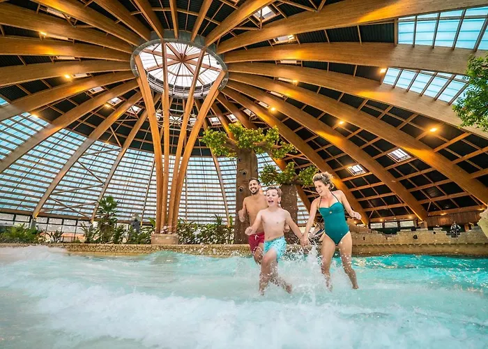 Les Ormes Domaine Et Resort offers various leisure activities with two outdoor unheated pools and an indoor aquatic area featuring slides and a wave pool. Guests can also participate in horseback riding lessons, enjoy tree adventure courses, or engage in golf practice across the 18-hole course.