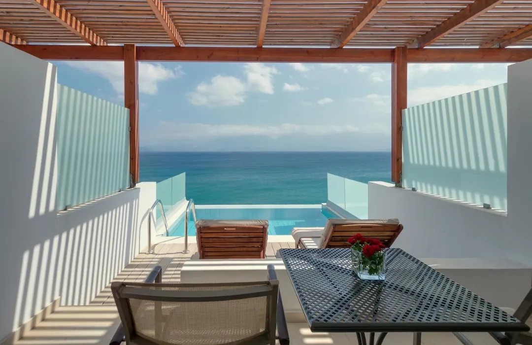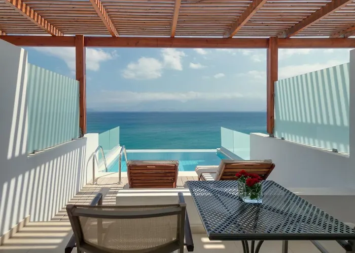 Miramare Resort & Spa offers 288 guest rooms, ranging from double rooms with sea views to luxury villas. Each room features contemporary decor, a balcony, and access to stunning views of the Mirabello Bay, ensuring a comfortable stay for all guests.