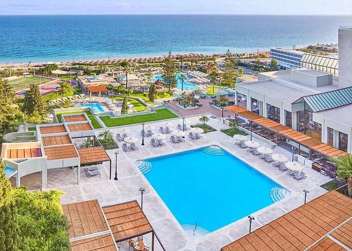 Sheraton Rhodes Resort, a 5-star Ixia (Rhodes) hotel, features a private beach and extensive amenities including three outdoor pools and an indoor pool in a luxurious setting. It provides dining options such as Thèa Restaurant and Knights' Bar, along with a Kids' Club for younger guests.