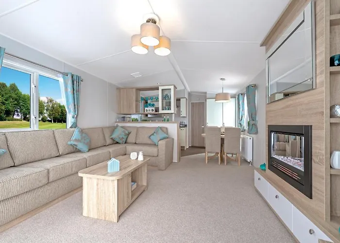Mobile homes at Par Sands Coastal Holiday Park include a flat-screen TV, seating area, and balcony. Each unit has a fully equipped kitchen with a refrigerator, oven, and microwave, suitable for self-catering needs.