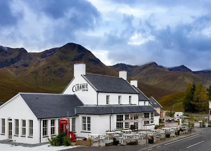 The Cluanie Inn is a 3-star Highland hotel known for its cozy atmosphere and unique character, providing a range of dining options and outdoor activities. Positioned between Loch Ness and the Isle of Skye, it features rustic rooms reflecting the region's wilderness lifestyle.